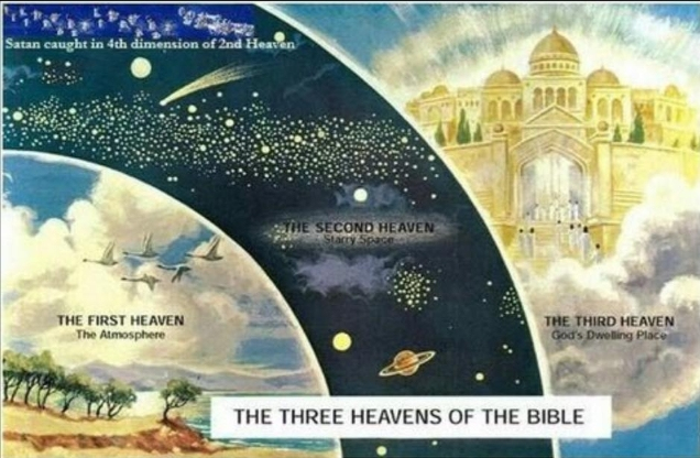 The three heavens and the earth, where; the first heaven is the Universe, the second heaven is the spiritual atmosphere in earth's atmospheric layer influence by mankind, and the third heaven is God's abode or the spritual heaven.